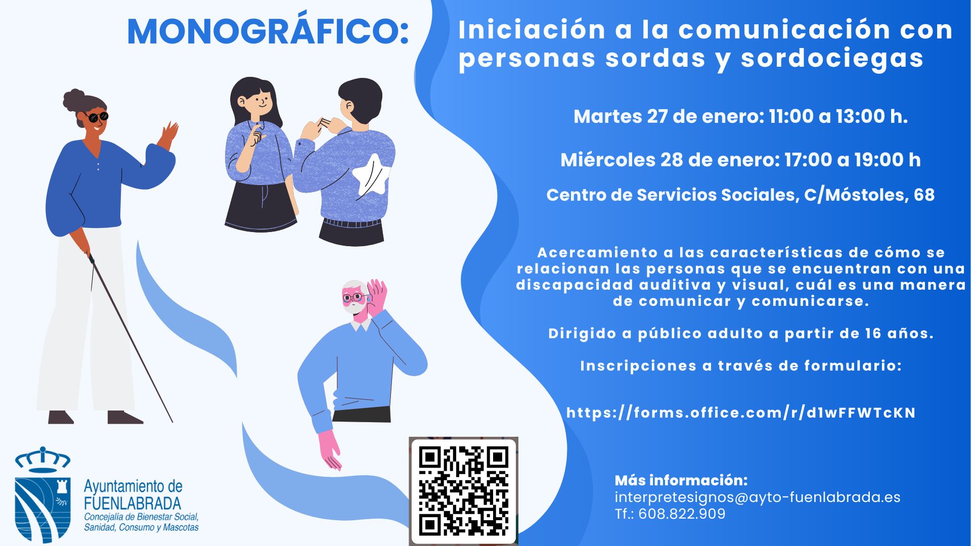 Desde el 29 dic. 2025 hasta el 26 ene. 2026.Desde el Programa de Diversidad Funcional de Servicios Sociales se ofrece curso de inicación a la comunicación con personas sordas y sordociegas como acercamiento a las características de cómo se relacionan las personas que se encuentran con una discapacidad auditiva y visual, cuál es una manera de comunicar y comunicarse.